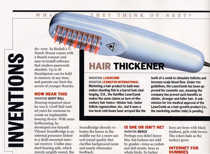 The HairMax LaserComb, a hand-held laser device that promotes thicker,